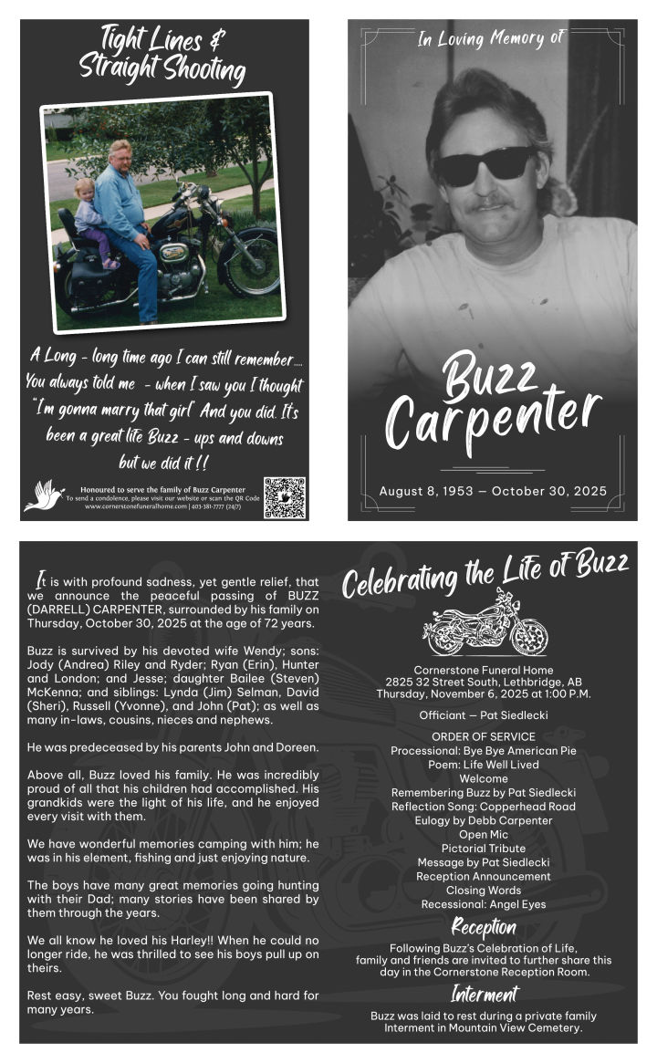 A Celebration of Buzz’s life will be held at CORNERSTONE FUNERAL HOME, 2825 – 32 Street South, Lethbridge, AB, on Thursday, November 6, 2025 at 1:00 P.M.