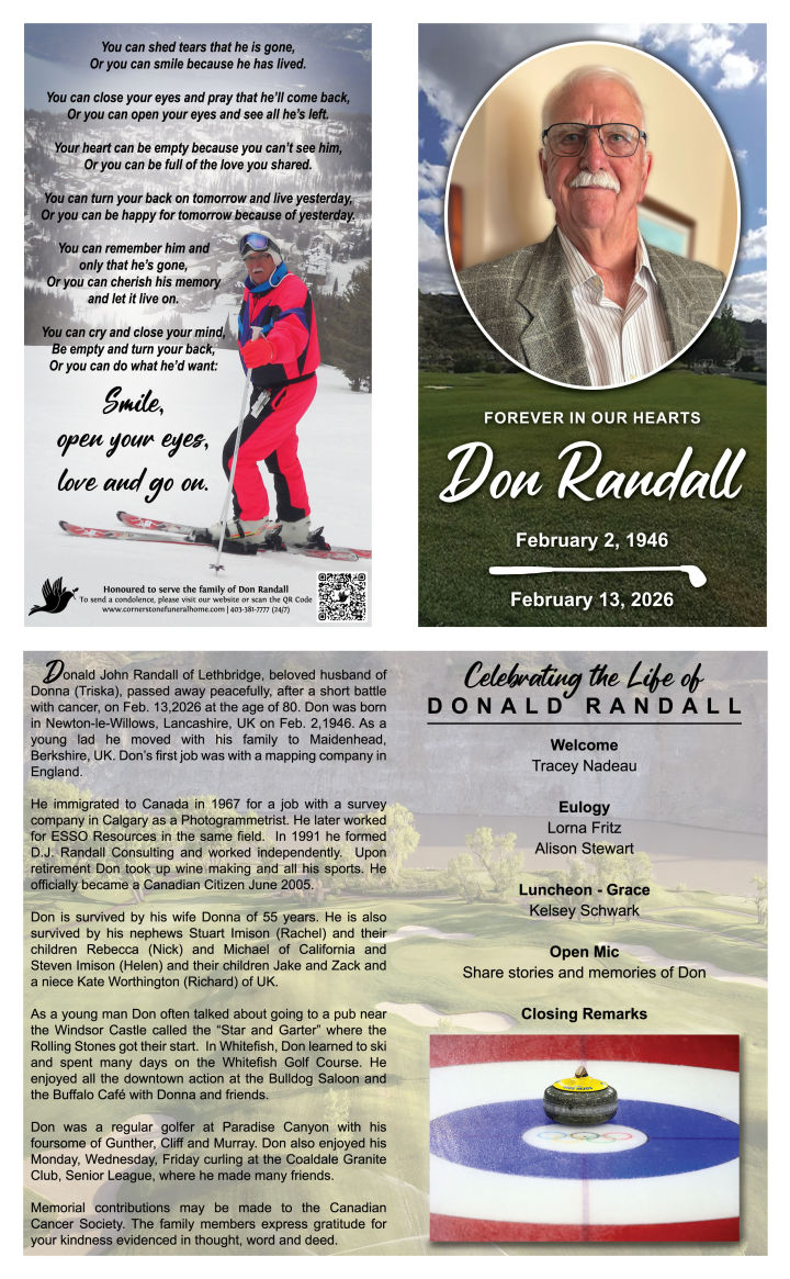A Celebration honouring the life of Donald “Don” Randall will be held at THE COAST LETHBRIDGE HOTEL & CONFERENCE CENTRE (Continental Room), 526 Mayor Magrath Drive South, Lethbridge, AB, on Saturday, March 7, 2026 from 2:30 P.M. to 4:30 P.M. Family and friends are welcome to share memories of Don during an Open Mic session.