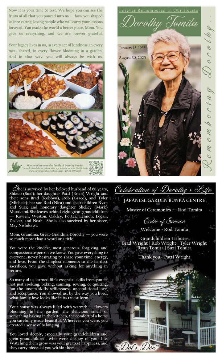 A Come and Go Celebration of life will be held at NIKKA YUKO BUNKA CENTRE, 835 Mayor Magrath Drive South, Lethbridge, AB, on Tuesday, November 18, 2025 from 4:00 P.M. to 6:00 P.M., with a short program at 4:30 P.M.