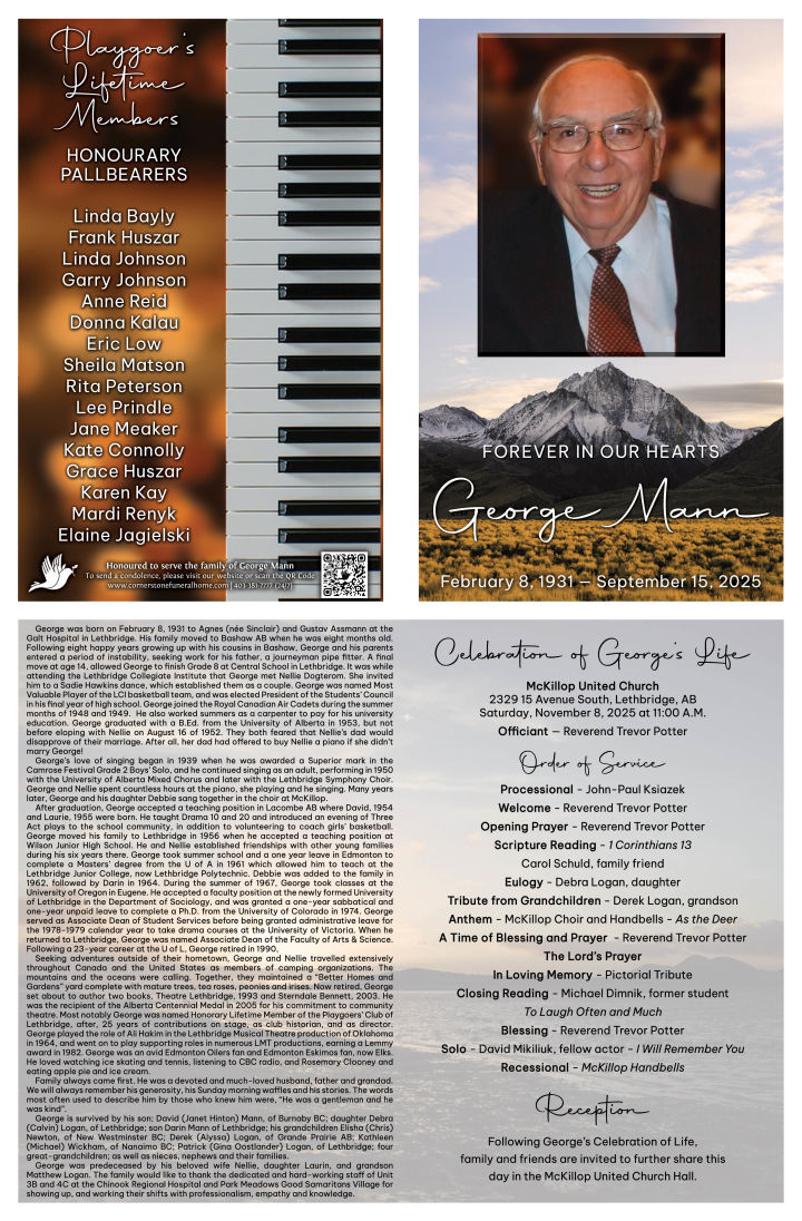 A Celebration of George’s Life will be held at MCKILLOP UNITED CHURCH, 2329 15 Ave S, Lethbridge AB., on Saturday, November 8, 2025 at 11:00 A.M. with Reverend Trevor Potter officiating. The Celebration of Life will be live-streamed and may be viewed through George’s obituary on the Cornerstone website.
