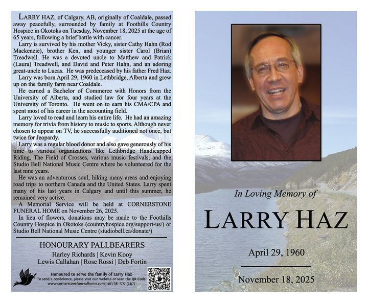 Larry is survived by his mother Vicky, sister Cathy Hahn (Rod Mackenzie), brother Ken, and younger sister Carol (Brian) Treadwell. He was a devoted uncle to Matthew and Patrick (Laura) Treadwell, and David and Peter Hahn, and an adoring great-uncle to Lucas. He was predeceased by his father Fred Haz.