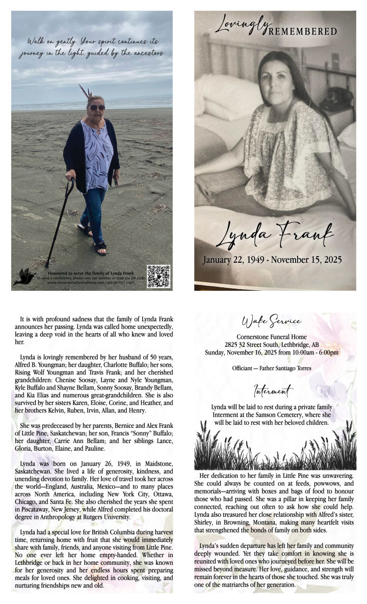 Lynda is lovingly remembered by her husband of 50 years, Alfred B. Youngman; her daughter, Charlotte Buffalo; her sons, Rising Wolf Youngman and Travis Frank; and her cherished grandchildren: Chenise Soosay, Layne and Nyle Youngman, Kyle Buffalo and Shayne Bellam, Sonny Soosay, Brandy Bellam, and Kia Elias and numerous great-grandchildren. She is also survived by her sisters Karen, Eloise, Corine, and Heather, and her brothers Kelvin, Ruben, Irvin, Allan, and Henry.