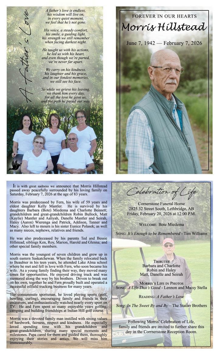 A Celebration of Morris’s Life will be held at CORNERSTONE FUNERAL HOME, 2825 - 32 Street South, Lethbridge AB, on Friday, February 20, 2026 at 12:00 P.M. A time of fellowship & refreshments will follow.
