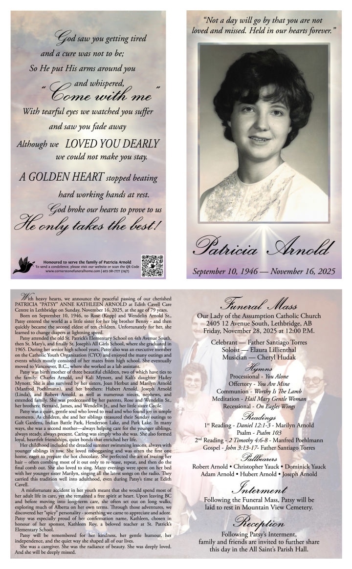 A Funeral Mass will be celebrated at OUR LADY OF THE ASSUMPTION CATHOLIC CHURCH, 2405 – 12 Avenue South, Lethbridge, AB, on Friday, November 28, 2025 at 12:00 Noon with Father Santiago Torres celebrating.