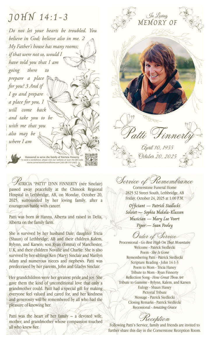 A Celebration of Life will be held at CORNERSTONE FUNERAL HOME, 2825 32 Street South, Lethbridge, AB, on Friday, October 24, 2025, at 1:00 P.M. The Celebration will be live-streamed and may be viewed through Patti’s obituary on the Cornerstone website.