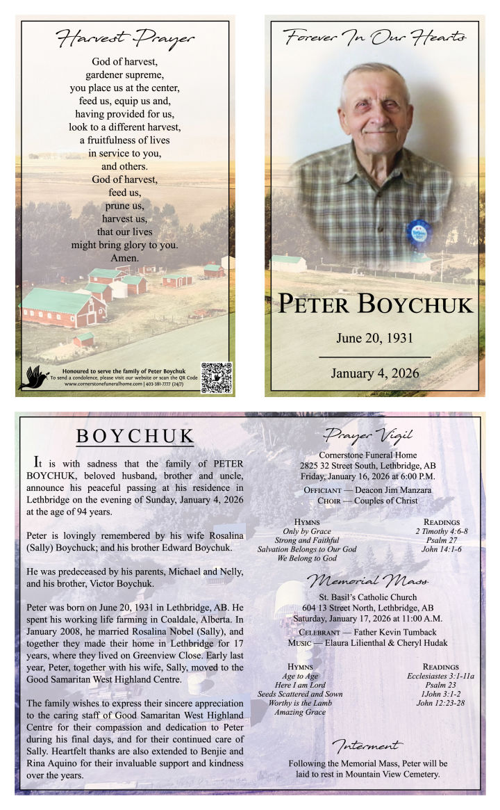 A Prayer Service will be held at CORNERSTONE FUNERAL HOME, 2825 – 32 Street South, Lethbridge, AB, on Friday, January 16, 2026 at 6:00 P.M. with Deacon Jim Manzara officiating.