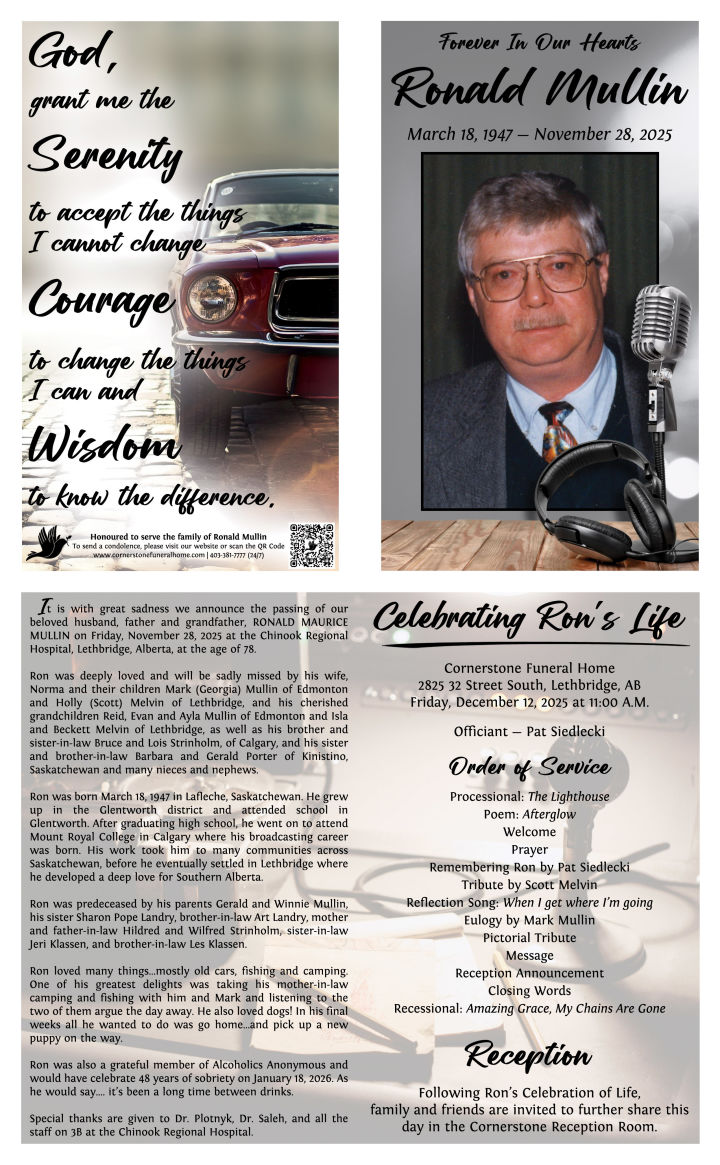 Ron was predeceased by his parents Gerald and Winnie Mullin, his sister Sharon Pope Landry, brother-in-law Art Landry, mother and father-in-law Hildred and Wilfred Strinholm, sister-in-law Jeri Klassen, and brother-in-law Les Klassen.