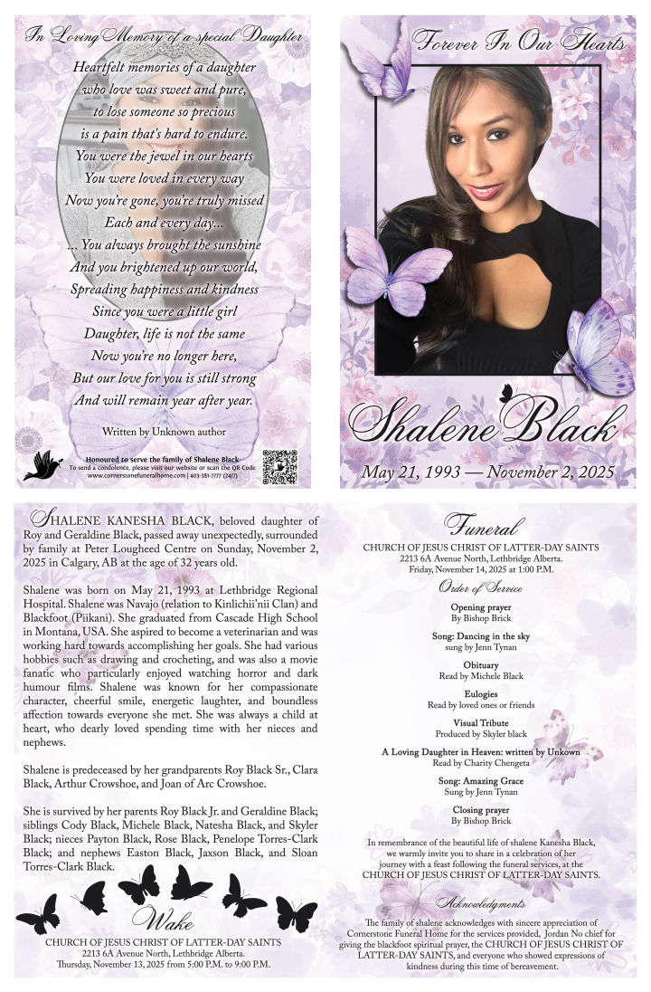Shalene is predeceased by her grandparents Roy Black Sr., Clara Black, Arthur Crowshoe, and Joan of Arc Crowshoe.