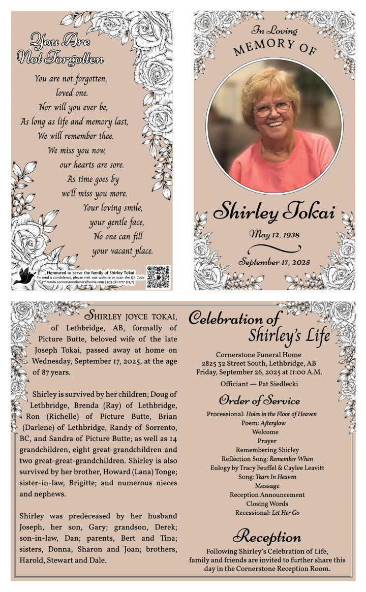 Shirley is survived by her children; Doug of Lethbridge, Brenda (Ray) of Lethbridge, Ron (Richelle) of Picture Butte, Brian (Darlene) of Lethbridge, Randy of Sorrento, BC, and Sandra of Picture Butte; as well as 14 grandchildren, eight great-grandchildren and two great-great-grandchildren. Shirley is also survived by her brother, Howard (Lana) Tonge; sister-in-law, Brigitte; and numerous nieces and nephews.