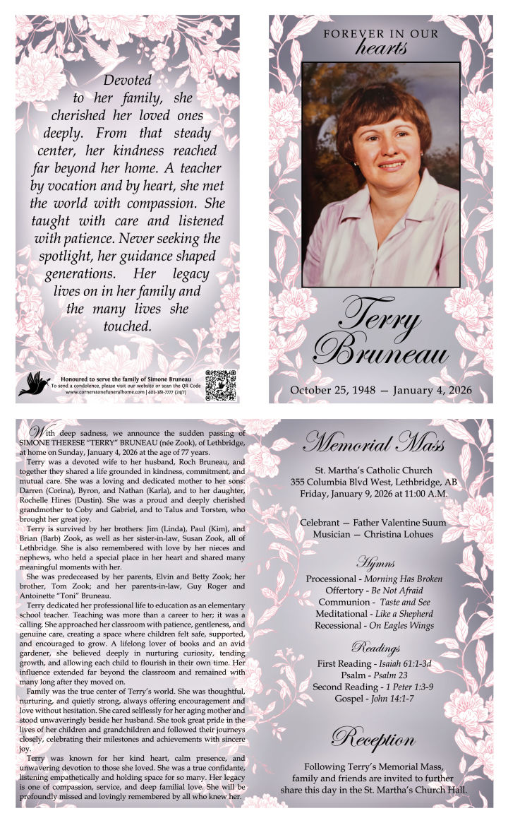Terry is survived by her brothers: Jim (Linda), Paul (Kim), and Brian (Barb) Zook, as well as her sister-in-law, Susan Zook, all of Lethbridge. She is also remembered with love by her nieces and nephews, who held a special place in her heart and shared many meaningful moments with her.