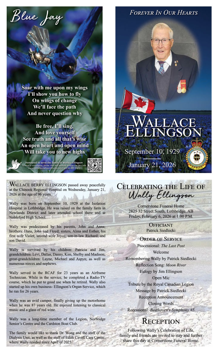 A Celebration of life will be held at CORNERSTONE FUNERAL HOME, 2825 – 32 Street South, Lethbridge, AB, on Friday, February 6, 2026 at 1:00 P.M. with Pat Siedlecki officiating. The Celebration will be live-streamed and may be viewed through Wally’s obituary on the Cornerstone website.