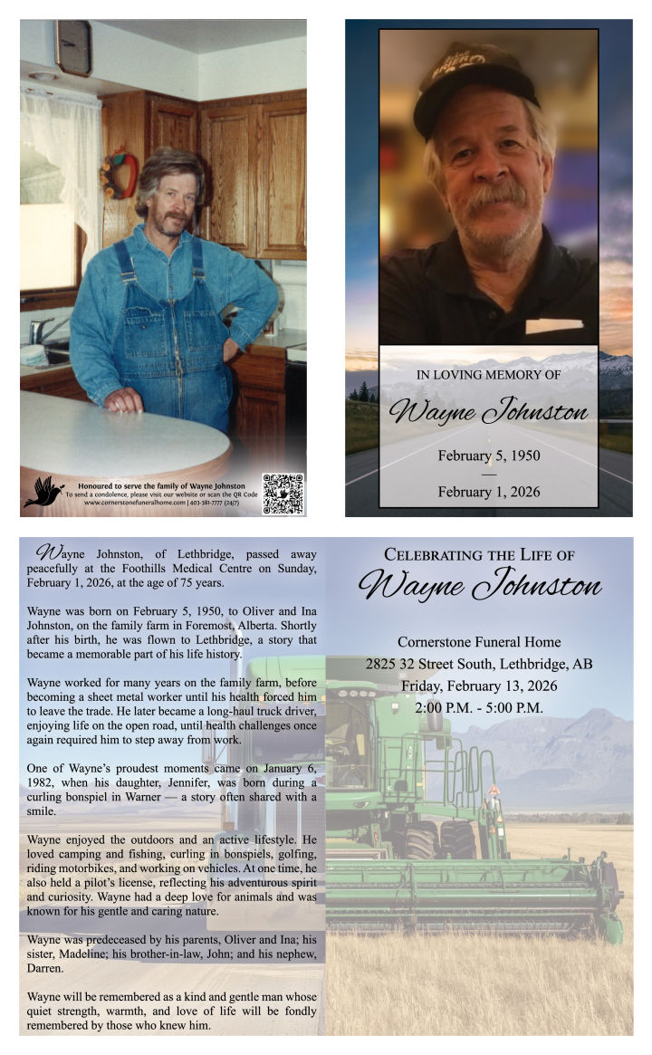 A Come and Go Celebration of life will be held at CORNERSTONE FUNERAL HOME, 2825 – 32 Street South, Lethbridge, AB, on Friday, February 13, 2026 from 2:00 P.M. to 5:00 P.M.